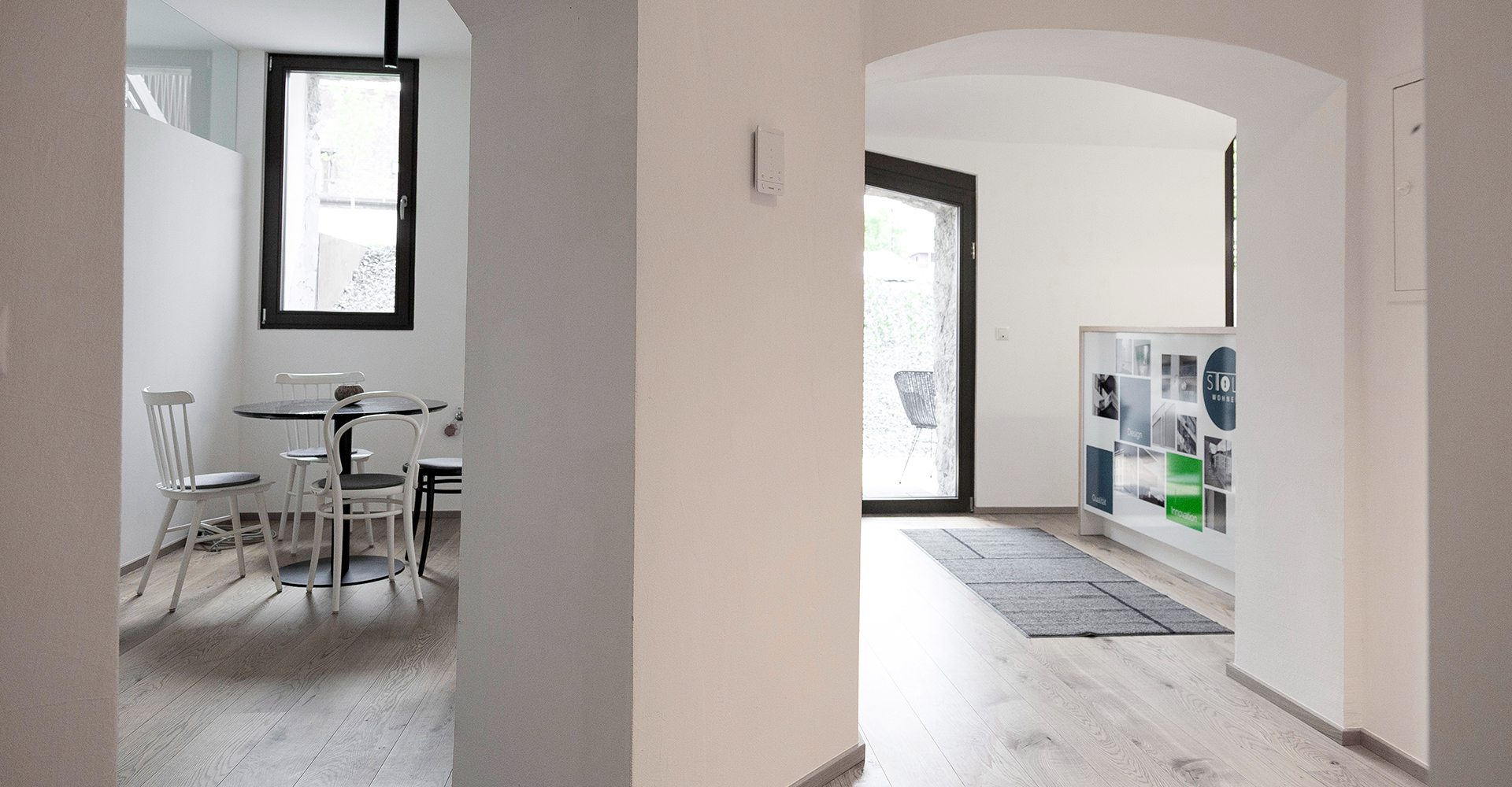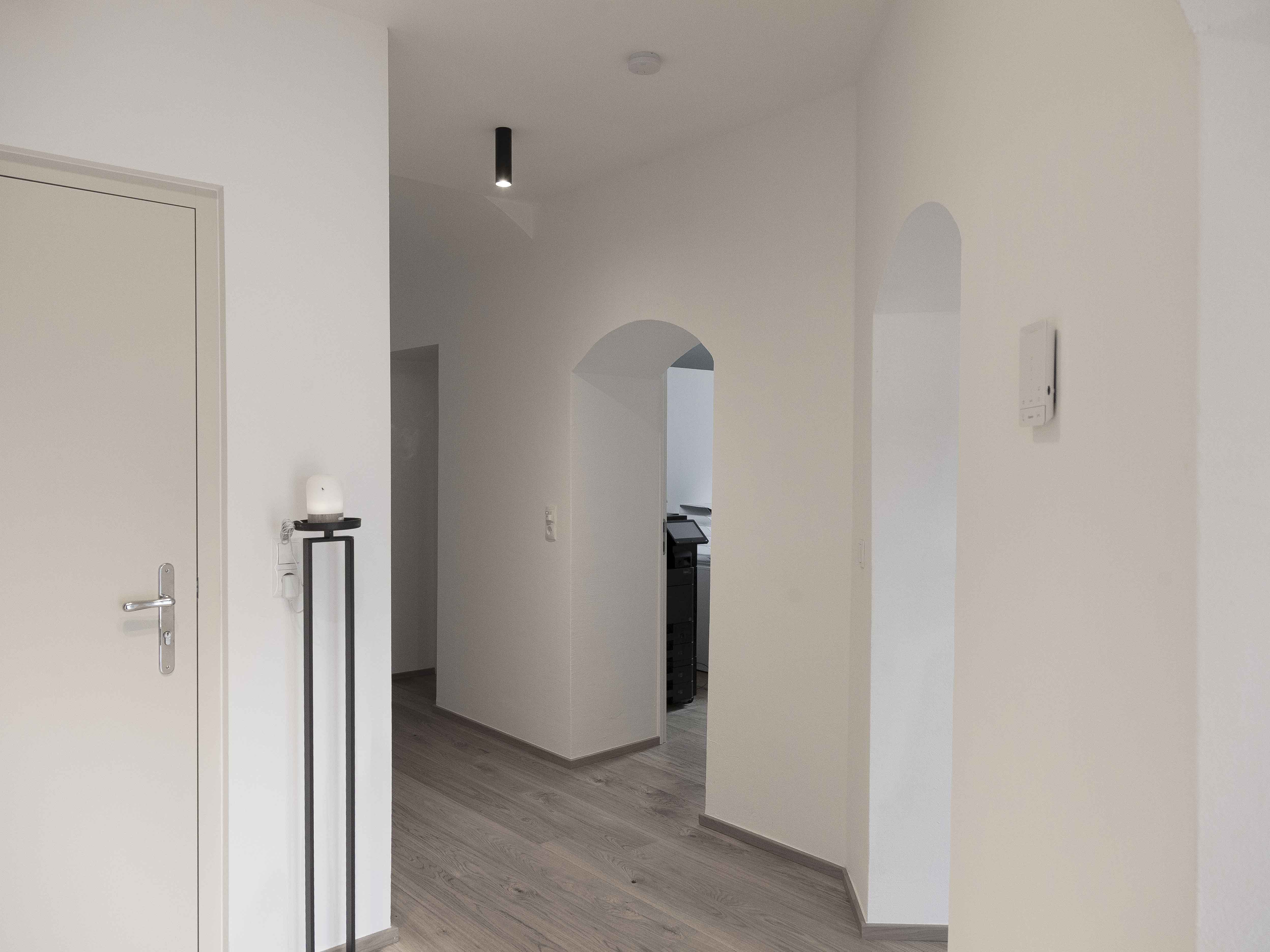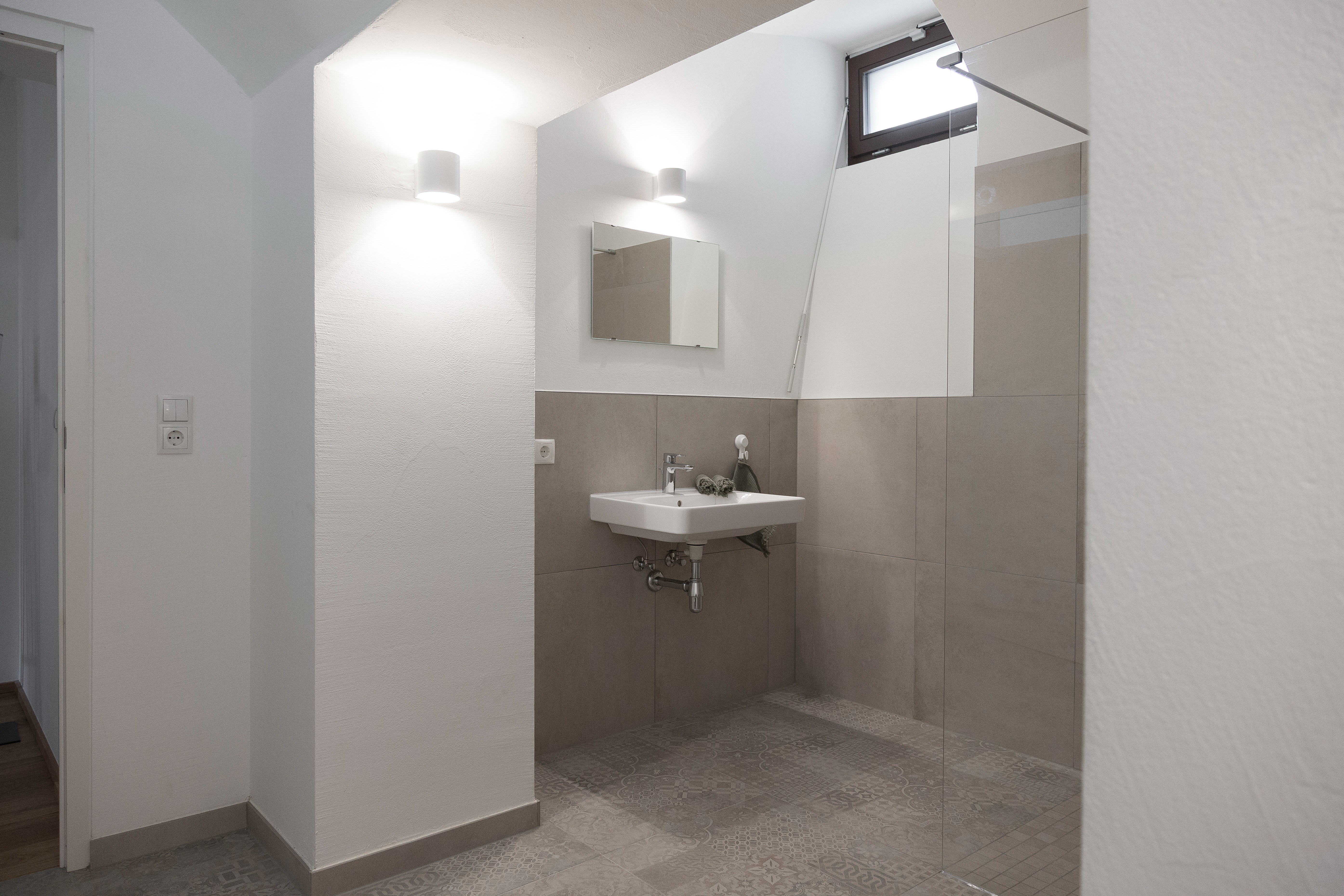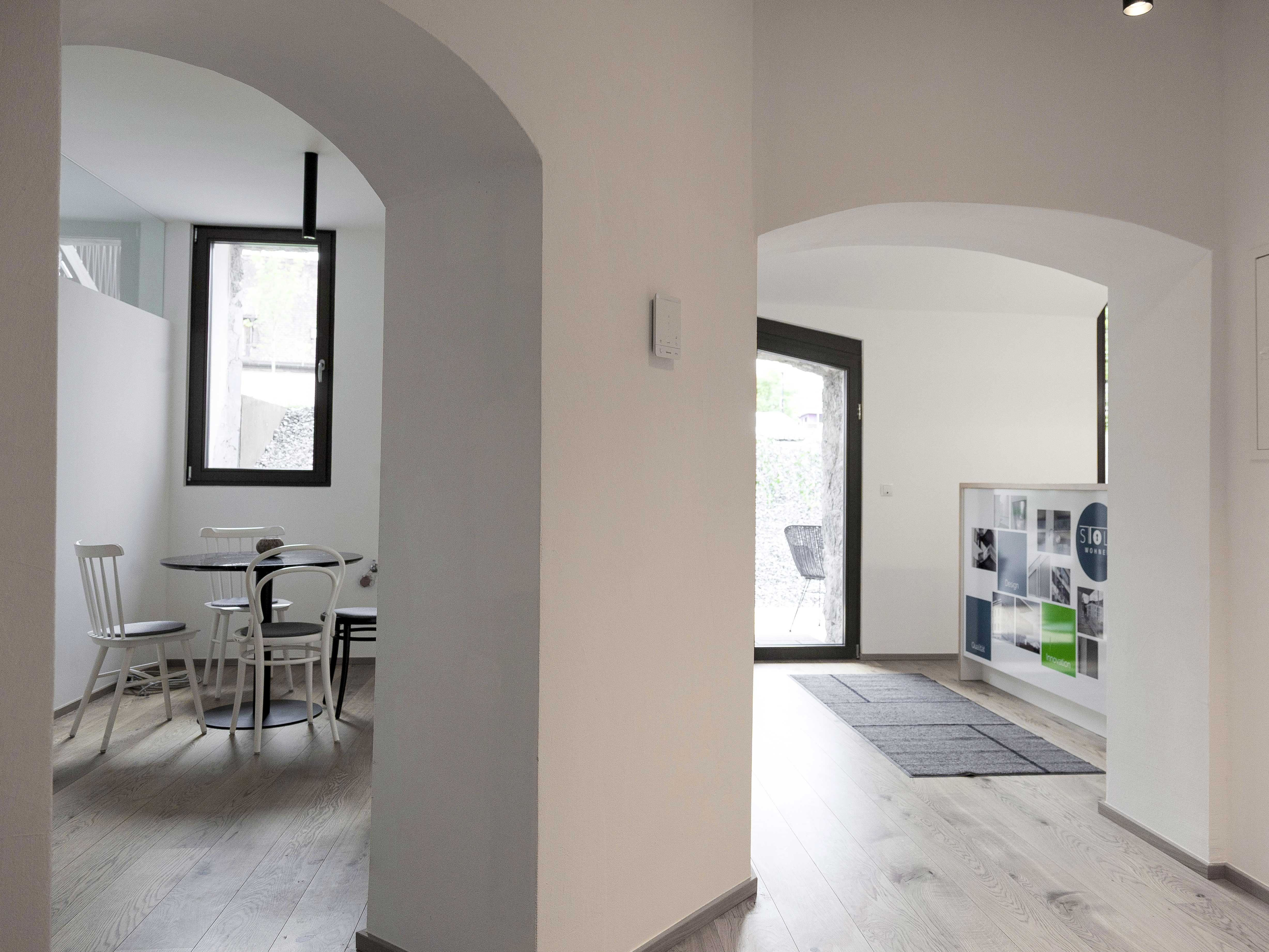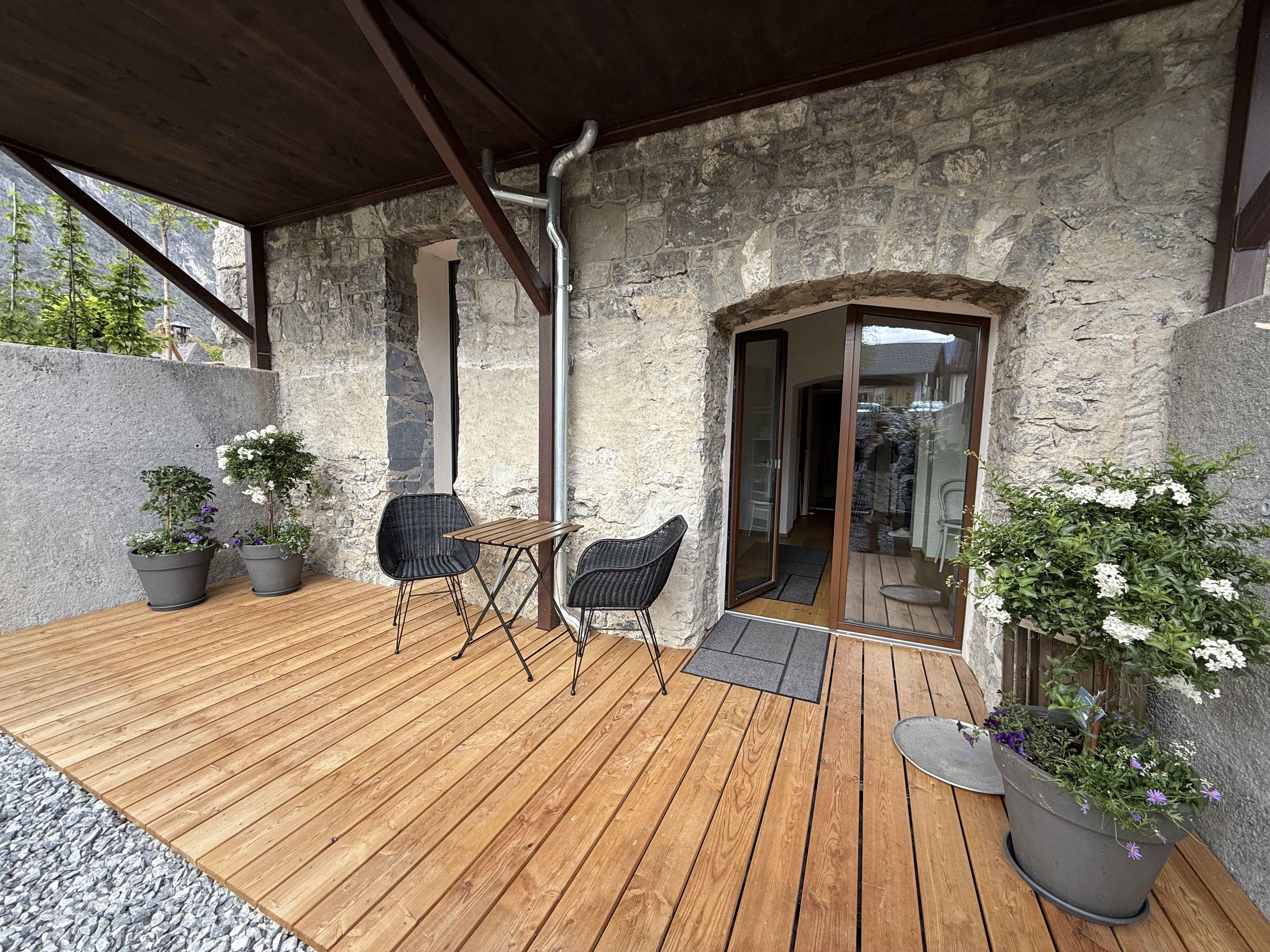 Die windgeschützte Westterrasse (ca. 12 m²) lädt zum Verweilen ein, das historische Mauerwerk verleiht dem Raum Tiefe und Authentizität. Innen sorgt moderne Technik für Komfort: Fußbodenheizung mit Fernwärme, Holzdielen und großformatige Fliesen treffen auf ein stilvolles Bad mit zeitgemäßer Ausstattung.