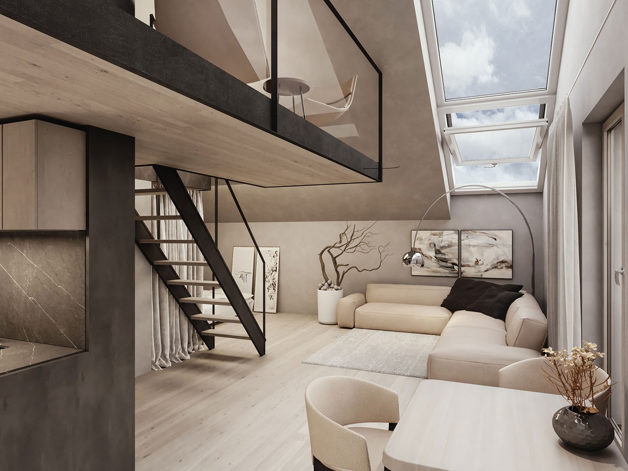 Die Architektur bringt Licht und Struktur in Einklang: Dachverglasungen öffnen den Raum nach oben, raumhohe Fenster betonen die vertikale Weite, und die klare Gestaltung vermittelt eine moderne Loft-Atmosphäre. Der Blick reicht, je nach Ausrichtung, über die Dächer der Stadt, zu den umliegenden Bergen oder hinauf zum Schloss Landeck.